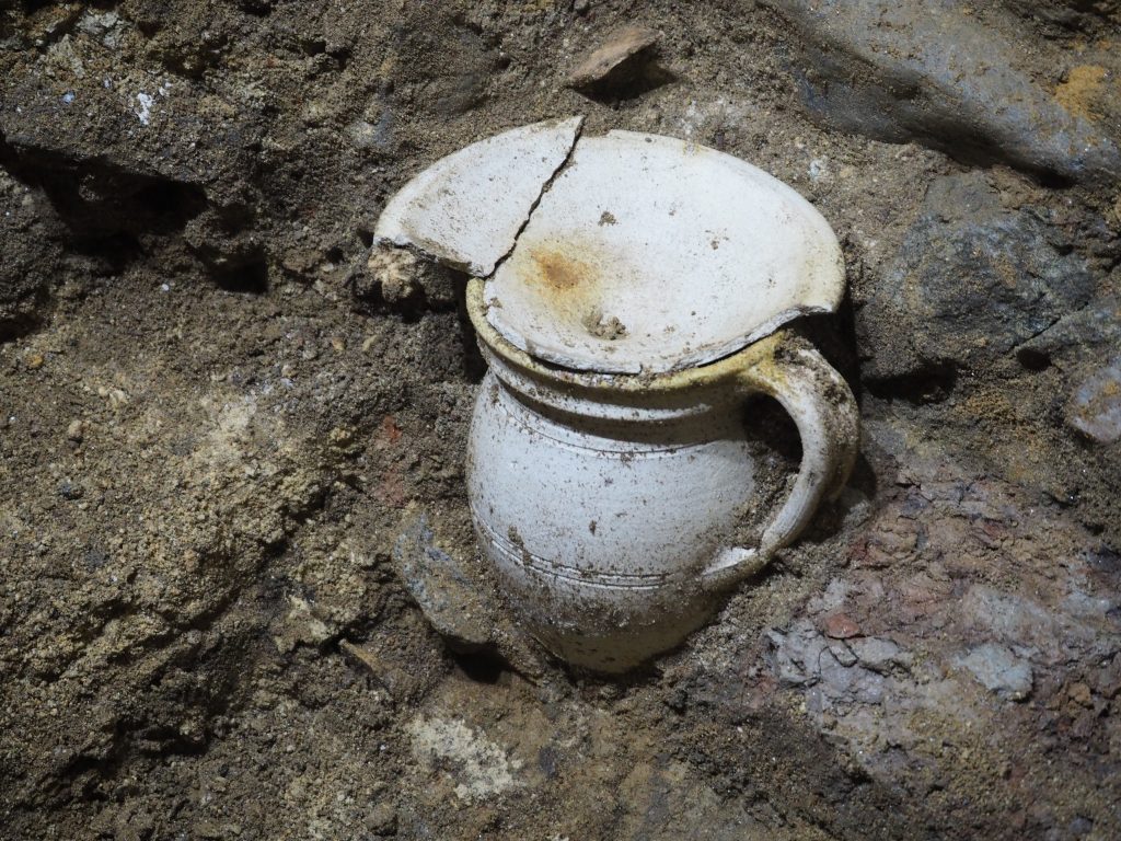Im Rahmen einer Machbarkeitsstudie zu der geplanten Sanierung und anschließenden Nutzung des Gebäudes als “Mitmachhaus“ wurden bereits Voruntersuchungen durchgeführt. Bei der Freilegung von Fundamentbereichen kam ein abgedeckter Keramikkrug zum Vorschein, vermutlich eine Nachgeburtsbestattung.